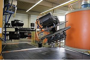 In der Kühlkammer wird der aufgeschmolzene Kunststoff auf seine Entnahmetemperatur von ca. 90 Grad herunter gekühlt. Damit das Material an den Innenwänden keine Ablaufspuren hinterlässt, bleibt der Formträger auch während des Abkühlungsprozesses in einer bi-axialen Rotationsbewegung.